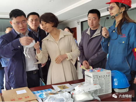 在防护用品展示区 省领导认真观察公司是否为员工发放符合国家职业卫生标准的个人防护用品