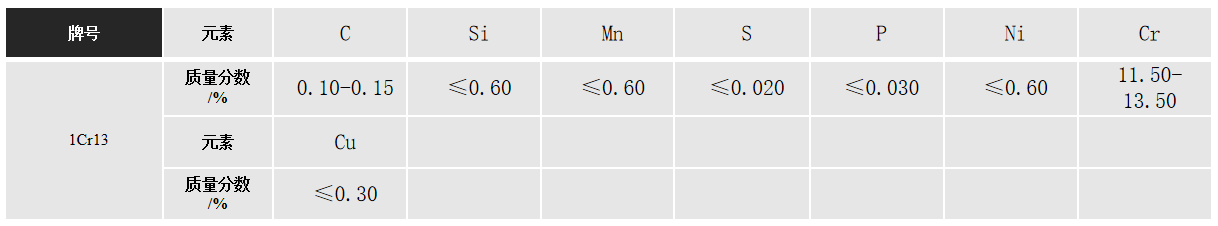 作为马氏体不锈钢,1Cr13也通过淬火和高温回火而获得较高的强度和良好的韧性。本钢种通常与2Cr13、3Cr13、4Cr13相比较,是四个牌号中碳含量最低者,因此强度也最低,而塑韧性最优。