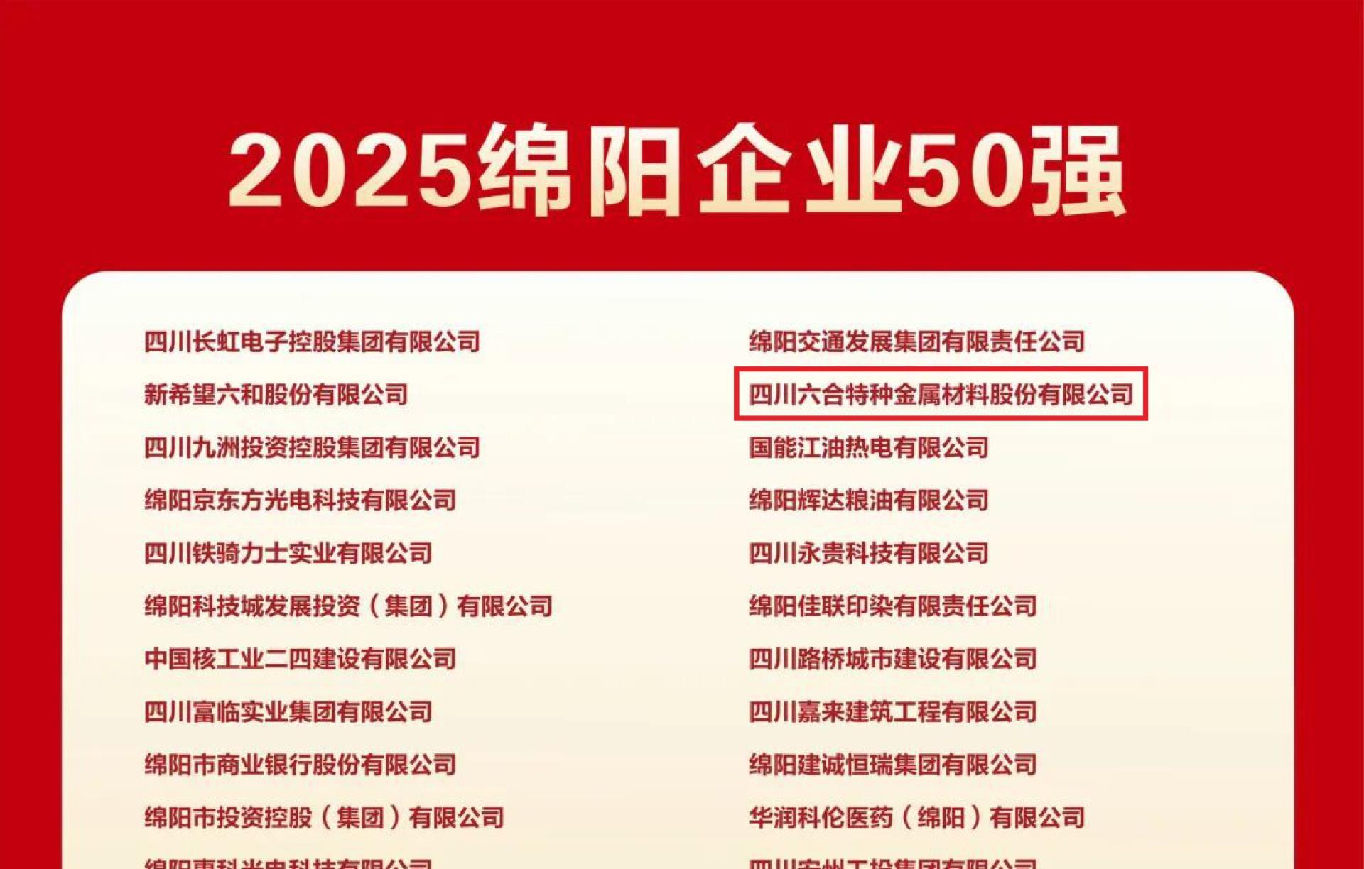 10 月 24 日,2025 绵阳企业 50 强发布会在四川绵阳工业园举行,best365英国体育在线(简称 “best365英国体育在线”)凭借特种金属材料领域的技术突破、稳健经营与产业贡献,成功入选,成为先进材料产业标杆。
